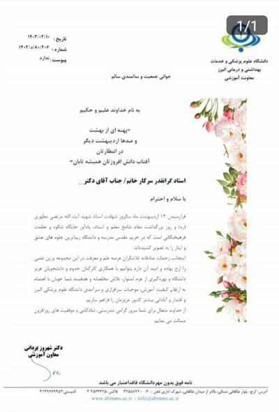 با سلام و احترام فرارسیدن ۱۲ اردیبهشت ماه سالروز شهادت استاد شهید آیت الله مرتضی مطهری (ره) و روز بزرگداشت مقام شامخ معلم و استاد ، یادآور جایگاه شکوه و عظمت فرهیختگانی است که در حریم مقدس مدرسه و دانشگاه زیباترین جلوه های عشق و ایتار را به تصویر کشیده اند اینجانب زحمات صادقانه تلاشگران عرصه علم و معرفت در این مجموعه وزین علمی را ارج نهاده و امید آن دارم بتوانیم با همکاری کارکنان خدوم و دانشجویان عزیز دانشگاه و بهره گیری از عزم استوار تلاش مخلصانه و هدفمند شما خوبان با اهتمام به ارتقاء کیفیت ،آموزش، موجبات سرافرازی و سرآمدی دانشگاه علوم پزشکی البرز و اقتدار و آبادانی بیشتر کشور عزیزمان را فراهم سازیم از خداوند متعال برای شما سرور گرامی تندرستی شادکامی و موفقیت های روز افزون مسالت می نماید .