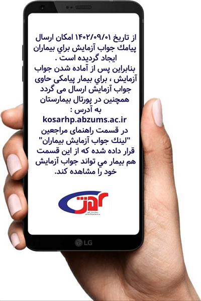 به گزارش روابط عمومي ، از تاريخ 1402/09/01 امكان ارسال پيامك جواب آزمايش براي بيماران ايجاد گرديده است، بنابراين پس از آماده شدن جواب آزمايش براي بيمار پيامكي حاوي جواب آزمايش براي بيمار ارسال مي گردد، همچنين در پورتال بيمارستان به آدرس kosarhp.abzums.ac.ir در قسمت راهنماي مراجعين "لينك جواب آزمايش بيماران" قرار داده شده كه از اين قسمت هم بيمار مي تواند جواب آزمايش خود را مشاهده كند .